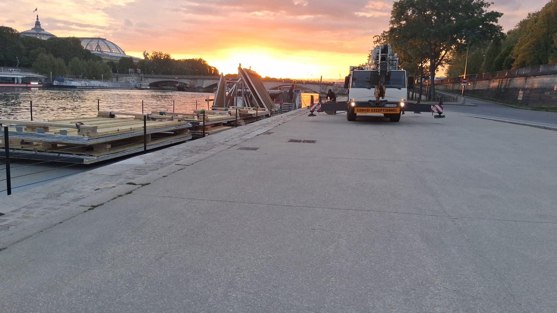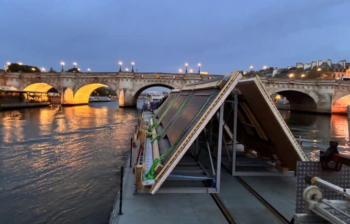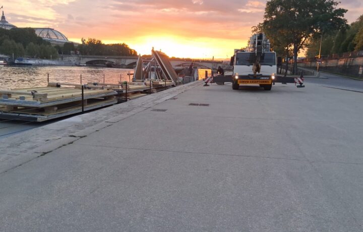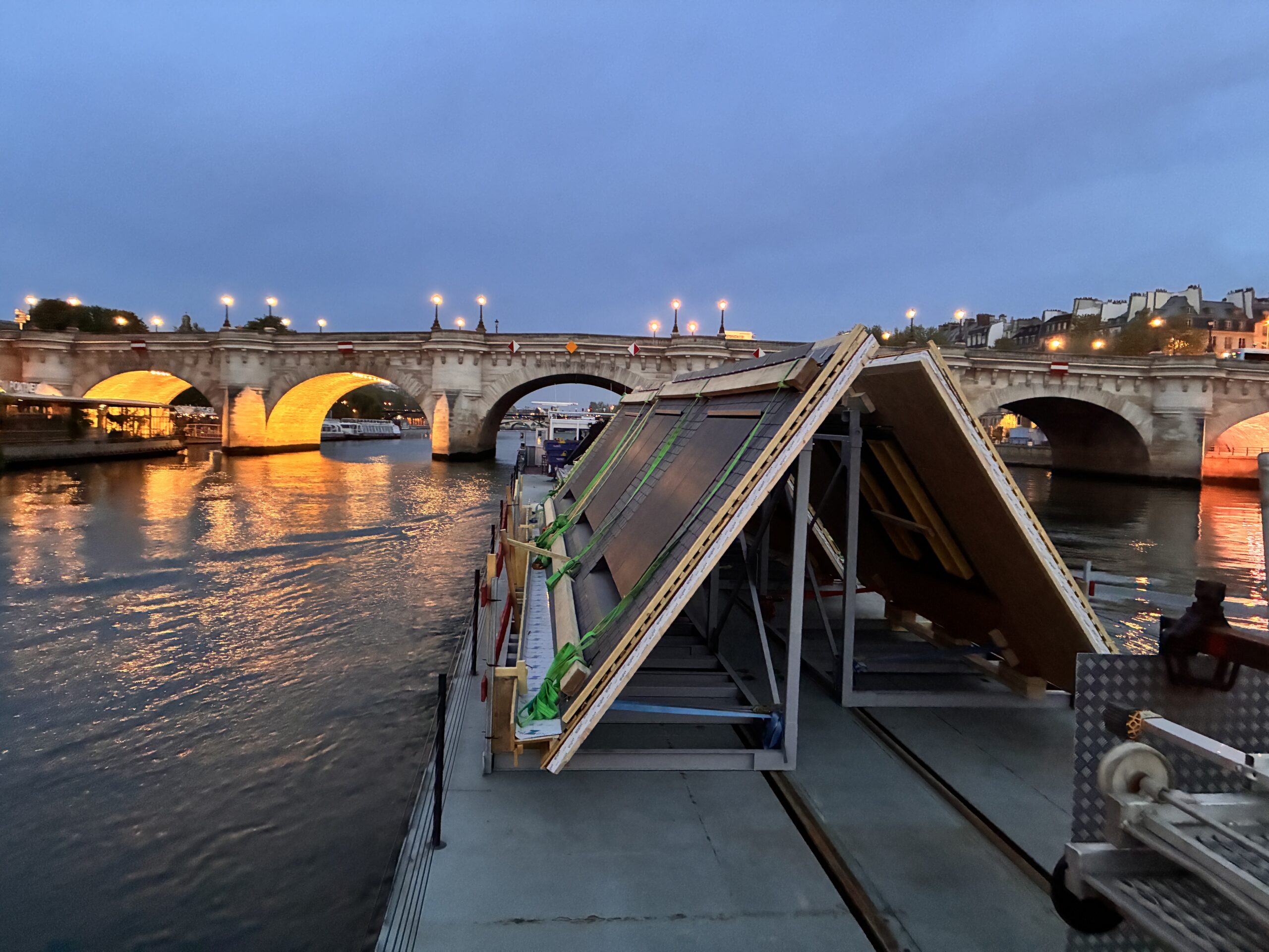 Depuis notre atelier de construction bois au port de Gennevilliers, 4 caissons de brisis et 2 caissons de terrasson ont été acheminés par voie fluviale jusqu’au port du Gros Caillou, à seulement 1 km de notre chantier des Champs-Élysées.