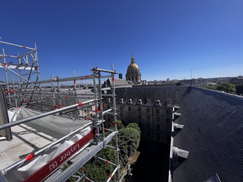 Le département couverture a participé à la restauration de la façade nord de l’Hôtel National des Invalides en posant de l’ardoise au clou et les habillages en plomb. Les chéneaux en cuivre ont été pré-façonnés dans nos ateliers de Gennevilliers pour gagner en productivité, en qualité de réalisation et en sécurité.