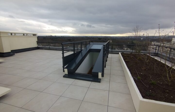 Pensé comme une véritable pièce à vivre à ciel ouvert, le rooftop a été aménagé avec des dalles sur plots et des espaces végétalisés, intégrant un système d’arrosage automatique pour un confort optimal au quotidien.