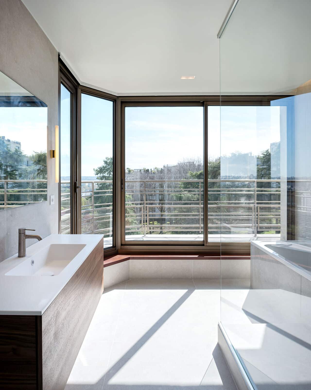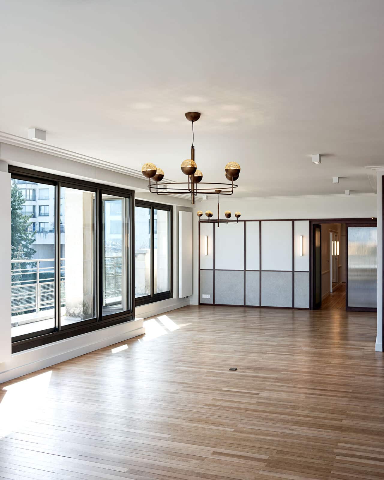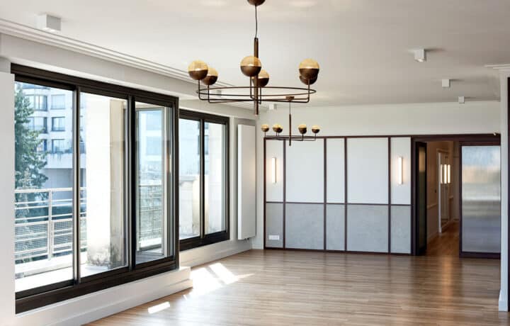 Nos équipes Balas ont rénové et restructuré un appartement de 250 m² avec une terrasse offrant une vue panoramique sur le Tour Eiffel et La Défense.